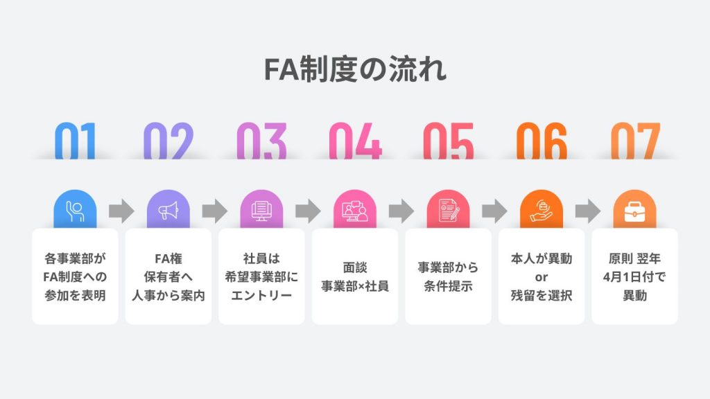 FA制度は、1年単位で計画的に運用されます。大まかな流れは以下の通りです。