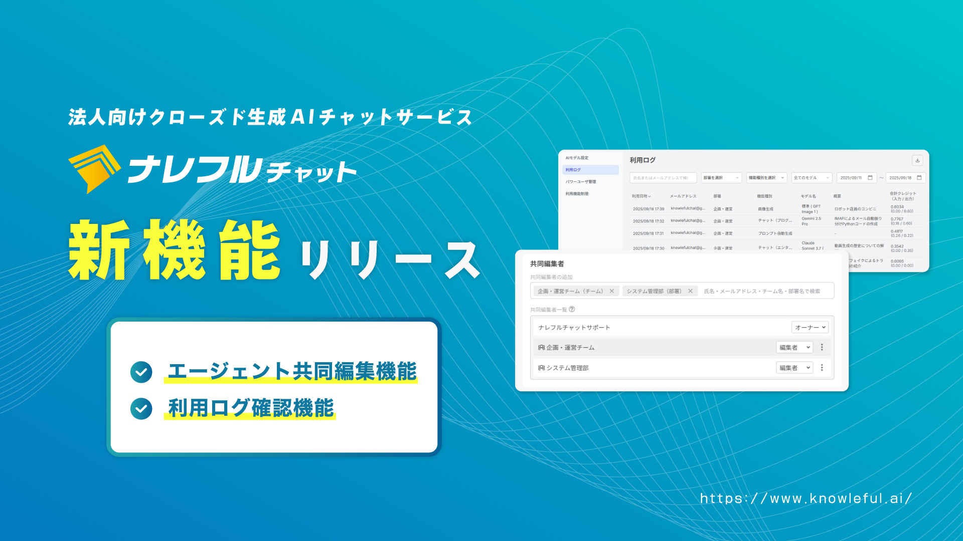 ナレフルチャット、組織内でのAI活用をさらに効率化する「エージェント共同編集機能」と「利用ログ確認機能」を新たにリリース