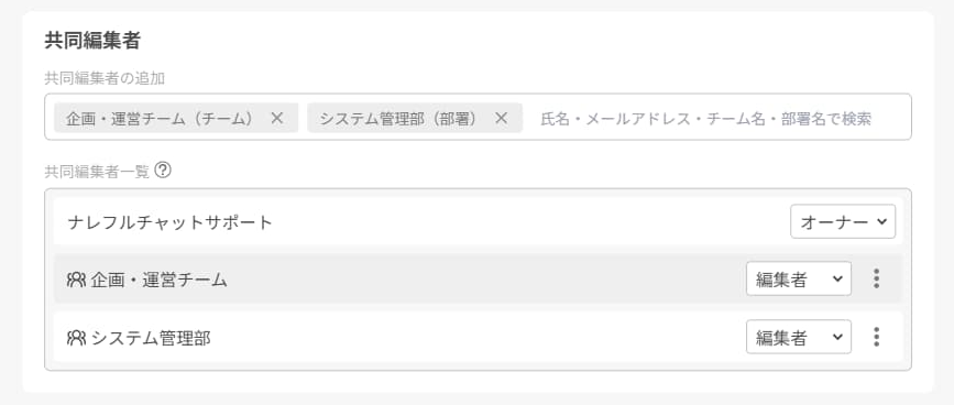 エージェントの編集権限は、特定ユーザーもしくはチームや部署単位で設定可能で、組織の体制に応じた柔軟な運用を実現します。