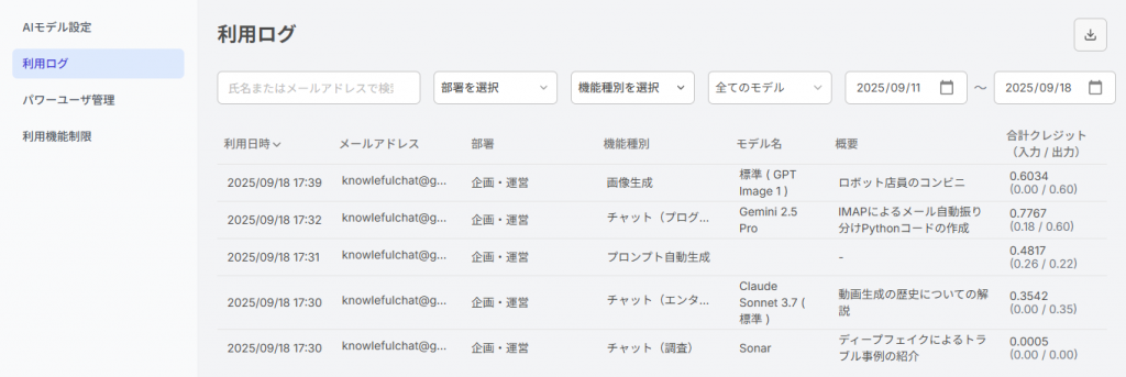 また、各機能の利用で消費したクレジット量も同時に確認でき、組織内でのAI活用状況を詳細に把握できます。