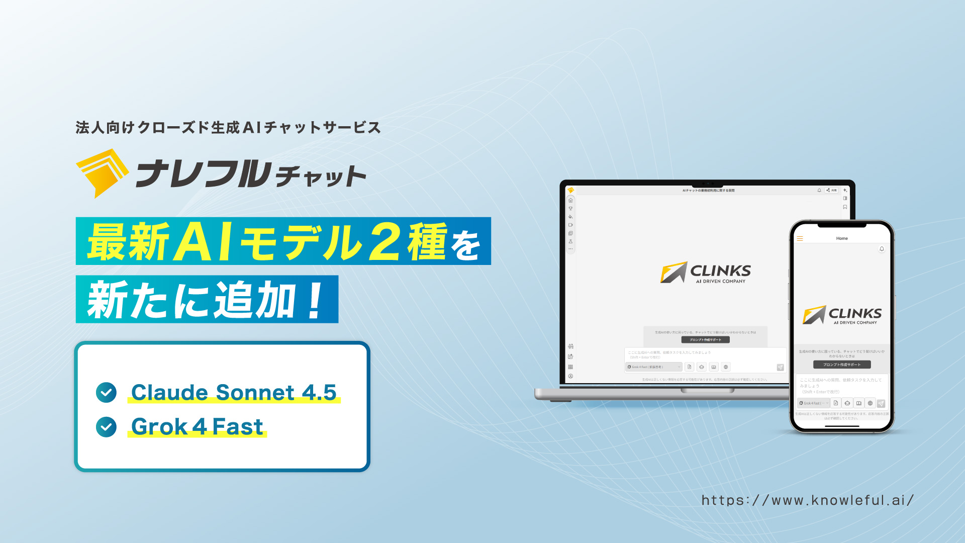 AIサービスやシステム開発を手掛けるCLINKS株式会社(本社:東京都中央区、代表取締役:河原浩介)は、提供する企業向け生成AIチャットツール「ナレフルチャット」において、最新AIモデル「Claude Sonnet 4.5」と「Grok 4 Fast」の2種を新たに追加し、2025年10月1日(水)より提供開始したことを発表いたします。