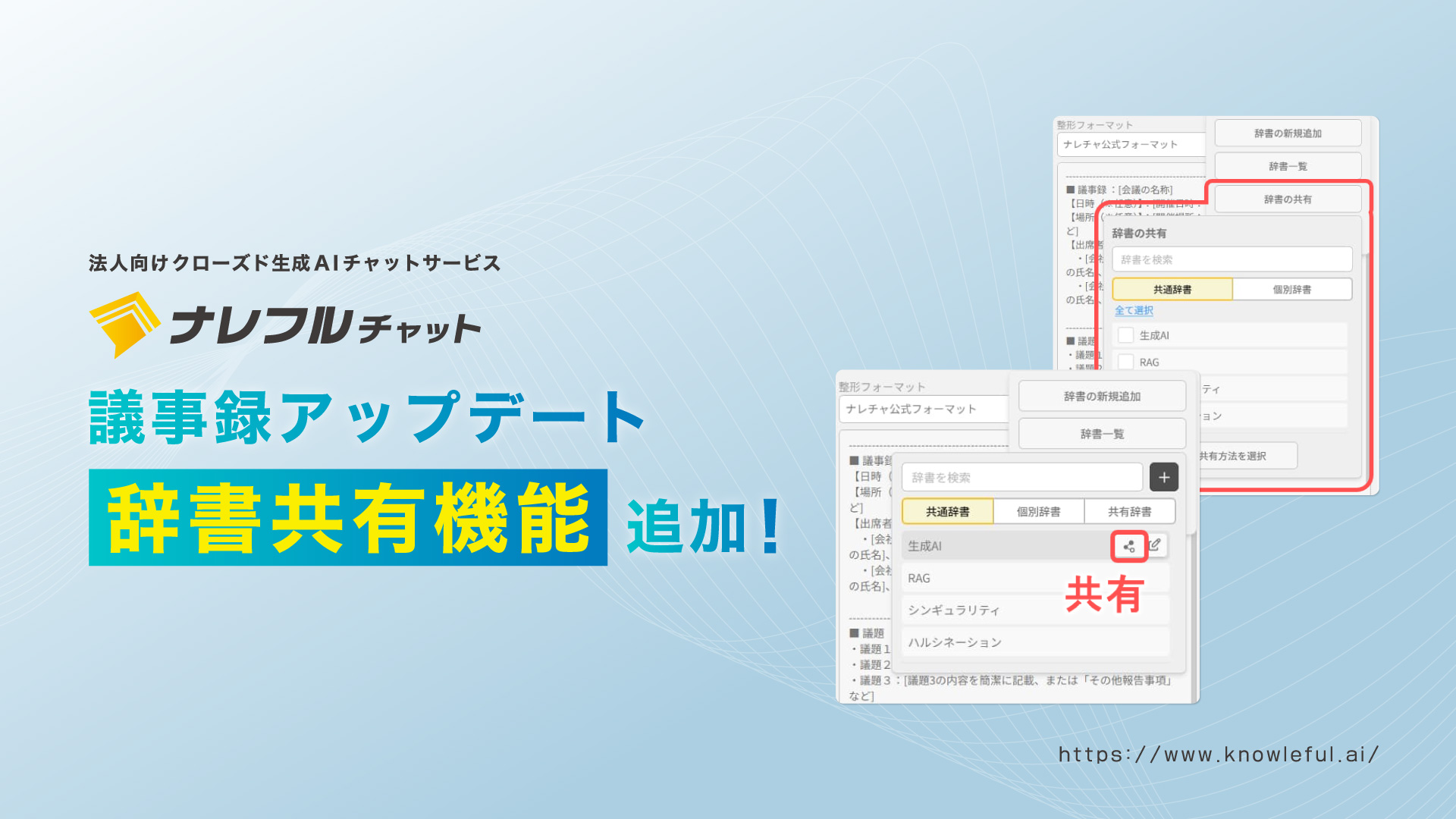 ナレフルチャット、議事録生成の「辞書」共有機能を追加~全社・チーム内での辞書共有により、専門用語や社内用語の誤変換を大幅削減~