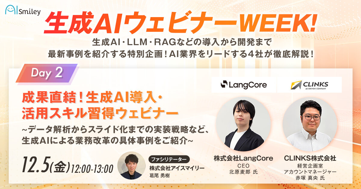 AIサービスやシステム開発を手掛けるCLINKS株式会社(本社:東京都中央区、代表取締役:河原浩介)は、2025年12月5日(金)、株式会社アイスマイリー主催の『生成AIウェビナーWEEK』に登壇いたします。本ウェビナーでは、コールセンターDXやGoogleWorkspace環境での資料作成など、データ解析からスライド自動化までの実装戦略を含む生成AIによる業務改革の具体事例を学べます。