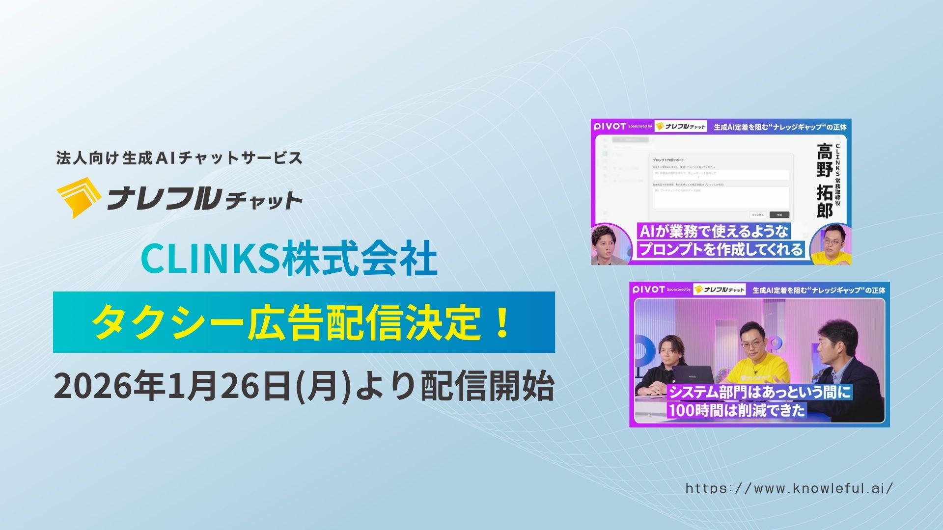 AIサービスやシステム開発を手掛けるCLINKS株式会社(本社:東京都中央区、代表取締役:河原浩介)は、法人向け生成AIチャットサービス「ナレフルチャット」のタクシー広告を、タクシーサイネージメディア「GROWTH」にて2026年1月26日週より順次展開いたします。