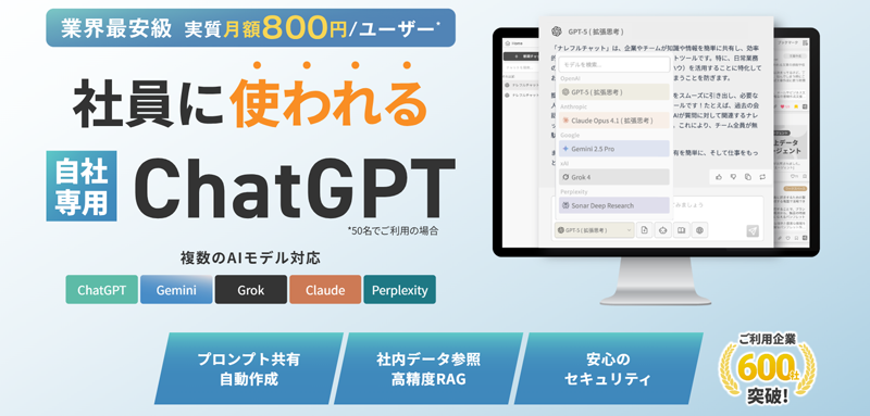 ナレフルチャットは、企業がクローズド環境でセキュアに利用できる対話型生成AIチャットツールです。生成AI初心者でも使いこなせる仕組みと簡単にプロンプト共有できることで組織全体に生成AI活用を浸透させます。これにより、企業全体のAIリテラシー向上と業務効率の向上を同時に実現します。