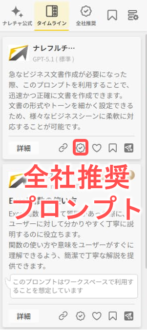 タイムライン上で社員が共有したプロンプトの中から、特に有用なものを管理者・運用者が「全社推奨プロンプト」として登録・共有できるようになる新機能です。推奨されたプロンプトは、全従業員がすぐにアクセス・活用できる形で表示されます。
